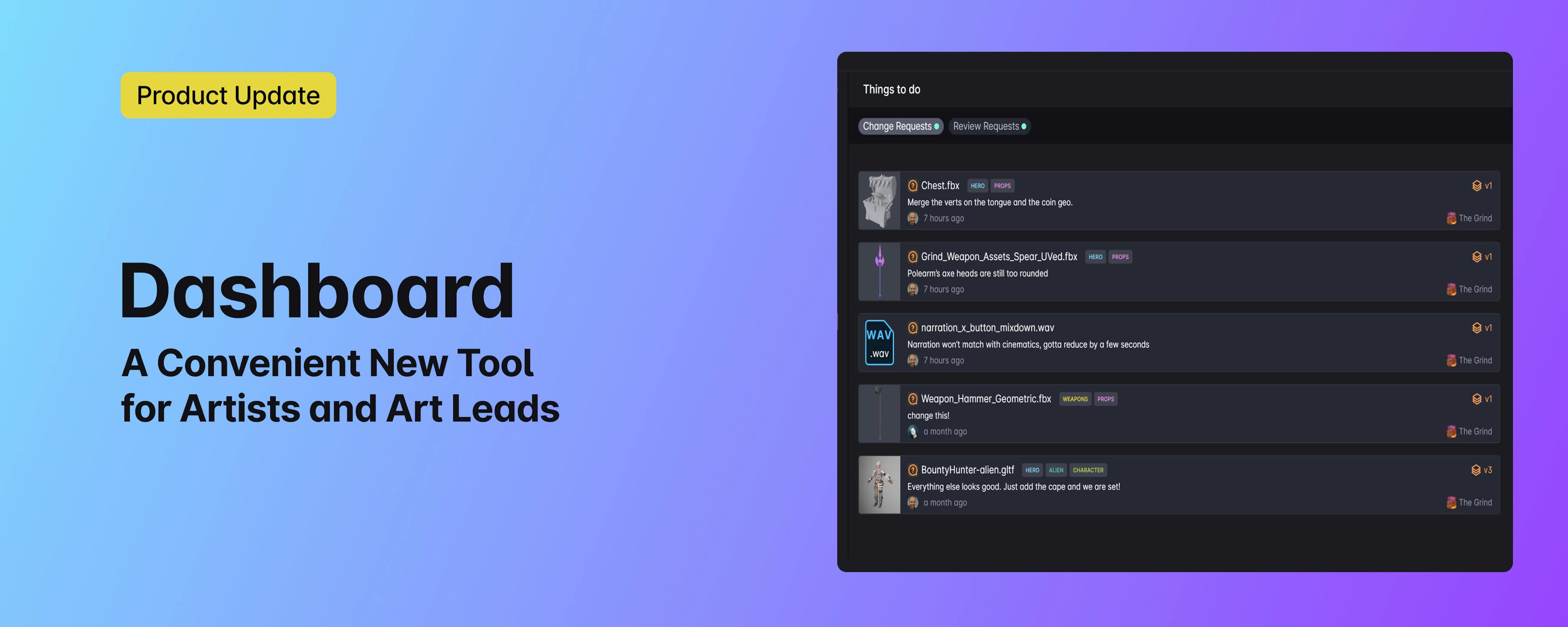 For art leads (art directors, project managers, lead artists), it's a great way to keep track of your review requests and notifications. With the Dashboard, you'll always know what needs to be done and when.